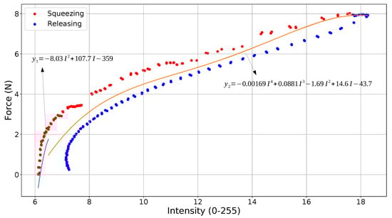 Figure 5 shows the force versus light intensity graph for squeezing and releasing the sensor. Loading and unloading the photoelastic silicone rubber are depicted in red and blue, respectively. Each measurement point in the plot is the average of 10 s measurements. In total, there were 100 points at which the silicone rubber was kept squeezed (1000 s or 16.6 min). In this connection, the shape of the rubber was not returned to its resting state by the end of the experiment, which resulted in the difference between the initial (red) and final (blue) light intensity values. This is known as compression set testing, by which the shape memory effect of the rubber can be quantified, as it takes time for the rubber to return to its original shape after prolonged compression. We did not observe this difference of the light intensity values when calibration was performed within 5 s of loading and 5 s of unloading (see Figure A2). The hysteresis curve is higher for the more dynamic deformation () than for the quasi-static deformation ().