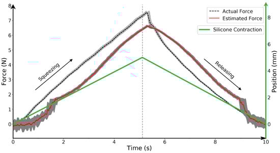 Comparative force sensing performance of the PhotoElasticFinger. Actual force is provided by an industrial force-torque sensor and compared with the estimated force provided by the proposed PhotoElasticFinger sensor. The gray areas represent the variance for 10 trials. Right-hand axis (green) represents the position of the gripper. Gripper speed = 1 mm/s.