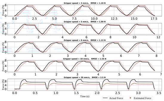 From Figure 7, it can be observed that as the speed rises, the RMSE value increases, with the largest error of 2.5 N with the fastest gripping speed of 30 mm/s. At 5 mm/s and 3 mm/s velocities, the RMSE is around 1.1 N. At 10 mm/s, the RMSE is higher and equal to 1.16 N.