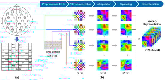 In the experiment, we generated 3D spatiotemporal representation of EEG signals as the input of the proposed model. To construct the 3D spatiotemporal representation, the EEG signals at a time point (1-s non-overlapping window) from all EEG channels were transformed into a 2D map (9 × 9 matrix) according to the positions of electrodes on the brain (Figure 2a). This preserves the topology of different electrodes. Then, radial basis function (RBF) interpolation [] was applied to fill in null values where the corresponding electrodes were not available. To improve the resolution of the 2D EEG feature maps, bicubic interpolation was employed to create the EEG feature maps with dimensions of 64 × 64. Bicubic interpolation was chosen as it allows for smoother resampling with fewer image artifacts compared to nearest-neighbor or bilinear interpolation []. Finally, a series of 2D maps from all time points was stacked to form the 3D spatiotemporal representation. The process for generating the 3D EEG representation is shown in Figure 2b.