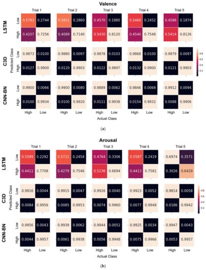 Confusion matrices of the binary emotion classification for (a) valence and (b) arousal for every trial (5 trials) for the LSTM model (top) and C3D model (middle) considered as baselines and the proposed CNN-BN model (bottom).