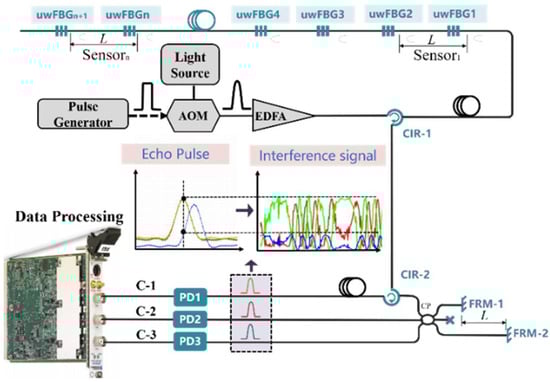 Figure 1 shows the structure of the path-match interferometric fiber-optic system. The continuous light emitted from a narrow linewidth laser is modulated into pulse light by an acousto-optic modulator (AOM), which is injected into circulator-1 (CIR-1) followed by amplification by an erbium-doped fiber amplifier (EDFA). Then, the pulse enters the uwFBGs array, and the echo pulse train reflected by the uwFBGs is transmitted to CIR-2. The arm length difference of the nonequilibrium interferometer constructed by a Faraday rotating mirror (FRM) is the same with the spacing of uwFBGs; therefore, optical path compensation can be realized in the interferometer by successive reflected pulses, thus completing the pulse interference. Finally, the interference pulse is converted by photoelectric detectors (PDs) into a field programmable gate array (FPGA) module for data acquisition and processing.