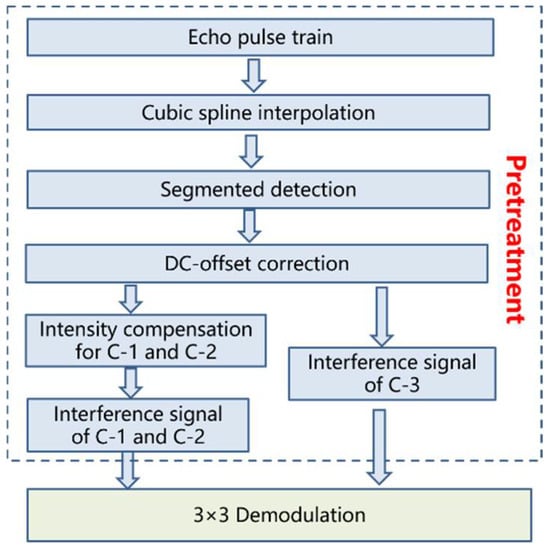 In order to solve the above problems, we proposed a pretreatment fiber-optic system with path-match interferometry, as shown in Figure 2. Firstly, cubic spline interpolation was used to make the pulse train smoother, as it can reduce the intensity noise of the interference signal to a certain extent. Secondly, the extreme value of the interference signal was determined by segmented detection, and the period of segmented detection should be obviously longer than that of the signal to be measured; thus, we used C-3 as the reference signal. The attenuation coefficient of C-1 and C-2 could be determined by extreme amplitude comparison, and the intensity of the interference signal of C-1 and C-2 was compensated to complete signal pretreatment. Finally, the modified three-way interference signal was demodulated based on a 3 × 3 coupler.