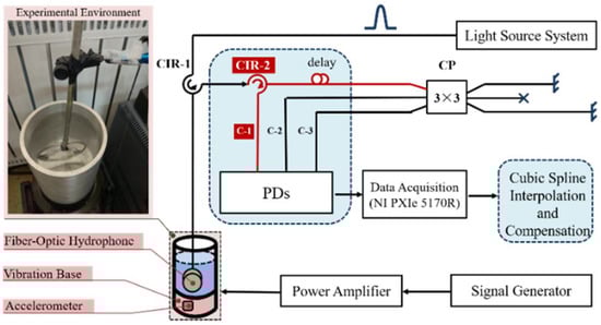 The experimental principle of the path-match interferometric fiber-optic hydrophone system is shown in Figure 3. To satisfy the interference conditions in a light source system, the narrow linewidth laser (DFB-M-1550-150-F-10-09MPF-FC/APC) had a bandwidth of 3 kHz and a central wavelength of 1550 nm. The AOM (T-M200-0.1C2J-3-F2S) generated a pulse period of 2 kHz and pulse width of 20 ns. The interference output of the 3 × 3 coupler was composed of three-way parts: C-2 and C-3 routes directly entered the PD, whereas route C-1 reached the PD through port 3 of CIR-2. The detection bandwidth of PDs (KG-200M-APR) is 200 MHz. In order to distinguish each narrow-pulse of sensor, the sampling rate of the data acquisition card (NI PXIe5170R) was set as 250 MSa/s. Finally, cubic spline interpolation and compensation were used to complete the pretreatment in order to achieve stable demodulation.
