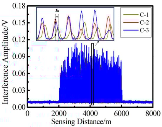 Figure 4 shows the three-way pulse signal of uwFBG TDM array with 800 sensors, whose sensing distance is 4 km. By amplifying the partial pulse signal, compared with C-2 and C-3, the C-1 pulse train had an overall offset of t0, so the amplitude of the C-1 interference signal indexed at the same position was greatly reduced, which verified the theoretical analysis mentioned above.