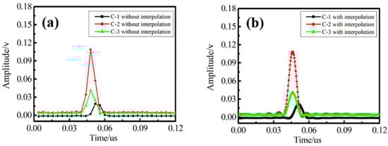 Comparison of echo pulse interpolation results. (a), Due to a small number of sampling points, the position corresponding to the pulse peak is prone to deviation, such as the black curve corresponding to channel C-1. (b), The pulse waveform is significantly improved, and the time position corresponding to the peak is more stable, which is conducive to obtain a more accurate peak change trajectory.