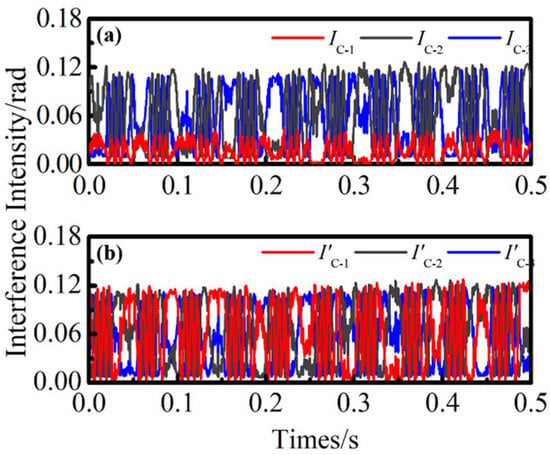 We performed an intensity compensation for the three-way signal, and the stable interference signals were obtained through cubic spline interpolation. The original interference signal and the interference signal of compensation are shown in Figure 7a,b. Because of the pulse delay caused by the CIR-2, the peak value of the IC-1 signal at the same position is greatly attenuated. However, I’C-1 is improved by linear compensation treatment, and its amplitude is basically consistent with I’C-2 and I’C-3. The results prove that linear compensation has a good effect and can effectively reduce the LID generated by pulse delay.