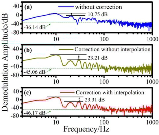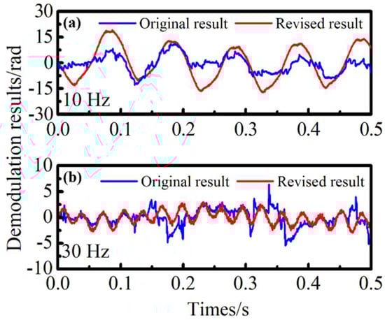 With cubic spline interpolation and linear compensation, the demodulation results are analyzed experimentally. Figure 8a,b shows the comparison of time domain demodulation results for 10 Hz and 30 Hz. Due to the influence of intensity noise, the time domain signals produced obvious distortion, and the demodulation amplitudes were also reduced. The results of algorithm application were effectively improved using the proposed method.
