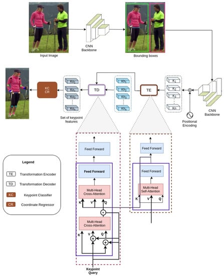 Human pose estimation has long been a compelling yet challenging problem. Fundamentally, human pose estimation [,] concerns discovering the configuration of the body parts of a human from either consecutive images or single images. In computer vision, human pose estimation has necessitated a paradigm shift due to its practical importance for behavioral analysis, video surveillance [], autonomous driving, human– computer interactions [], healthcare, computer animation, skeleton action recognition [], and video retrieval []. Recently, deep convolutional neural networks (DCNNs) have proven their capacity for visual understanding [,] and recognition [,] in terms of capacity and efficiency in human pose estimation. However, pose estimation is inherently challenging due to the ways that body shape changes in motion, inter- or intra-person occlusion, and background clutter. Recent pose estimation approaches can be roughly categorized into two groups: heatmap-based and regression-based approaches. Heatmap-based approaches adopt handcrafted features and heuristic pre/post-processing to encode an image to heatmaps, and then decode these heatmaps to predict keypoints. However, this approach faces challenges such as difficulties in updating and adaption. Regression-based approaches instead perform regression for the keypoints directly, entailing fewer intermediate stages and specifications. Although their performance is not on par with the heatmap-based approaches, they can be made end-to-end and readily integrated with other downstream tasks. In addition, regression-based approaches also aim to remove unnecessary designs by making the training objective and target output direct and transparent. Inspired by the recent regression-based method for pose estimation [], we present a two-stage transformer approach for 2D pose estimation. Specifically, we use cascading transformers, consisting of a person detection transformer and a keypoint detection transformer. Cofopose differs from existing approaches insofar as it consists of conditional cross-attention, conditional DETR, and the use of encoder-decoders in the transformer architecture to achieve person and keypoint detection. That is, we leverage conditional cross attention and conditional DETR for person detection, and use encoder-decoders in the transformer to detect the keypoints. Cofopose shows competitive results in pose recognition compared with the existing regression-based and heatmap-based methods. In brief, the contributions of our work can be summarized as follows: