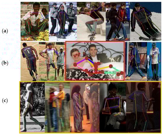 Visualization of the pose estimation results of Cofopose using some image samples from the MS-COCO dataset. Rows (a,b) are results estimated from images with good illumination, with the exception of the picture with the red border from row (b), which is occluded by clothes. Even though the image with the red border looks more occluded, Cofopose was able to estimate the pose accurately; (c) shows Cofopose results on blurred and low-illumination images.