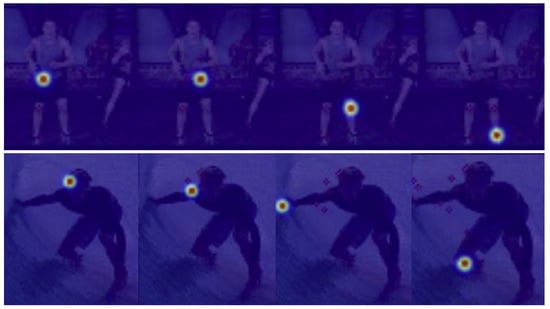 Visualization of Cofopose’s process of decoding for the keypoint detection transformer on MPII and COCO is denoted by the first and second rows, respectively. For MPII, the first, second, third, and fourth columns represent the right hip, left hip, left knee, and left ankle, respectively. For COCO, the first, second, third, and fourth columns represent right eye, right shoulder, right wrist, and right knee, respectively.