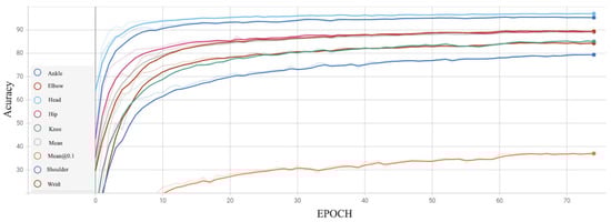 We utilized the AdamW optimizer [] during model training. The baseline learning rate for the ResNet backbone was set to 1 × 10−5 whereas both the remaining part and the weight decay were set to 1 × 10−4. The dimensions of the input image snippet setting were 384 × 288 or 512 × 384 for COCO, and 384 × 384 or 512 × 512 for MPII. We used the default parameters for HRNet [] and Simple Baseline []. For the person detection transformer, we began by adapting the method [] for tuning a person detector using weights developed by DETR [].
