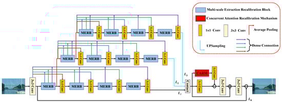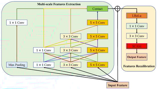 As shown in Figure 4, MERB will enter the feature recalibration stage after passing the feature extraction. First, we perform feature stitching on the multi-scale feature information; then, we use the convolution kernel of size and for further deep extraction; and finally, we also introduce CARM to recalibrate the feature information. The final output of MERB is as follows: