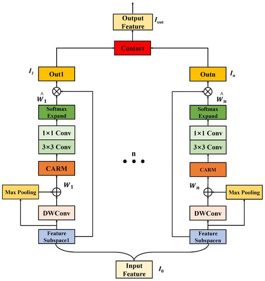 The parallel coordination and subspace attention mechanism focuses on acquiring spatial and channel feature information and allows only features containing useful information to be further transmitted. As shown in Figure 2, the SCAM divides the input feature map () into n mutually exclusive subspaces: . We define as a set of intermediate feature maps, and its overall architecture can be formulated as:
