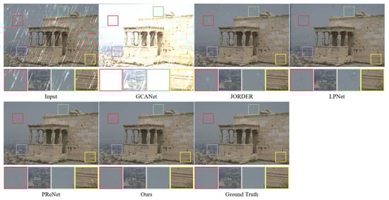 We present various images for visual comparison in addition to the quantitative evaluation of the rain removal impact of a single image. As shown in Figure 5 and Figure 6, images derived from the small rain dataset Rain100L and the large rain dataset Rain100H are provided for visual comparison, respectively, and some areas of the images are selected and magnified in order to observe changes in image detail information. By observing the magnified local area, it can be found that although the GCANet algorithm is less effective in removing rain streaks, a large number of rain streaks remain; JORDER, LPNet, PReNet, and RESCAN remove a large number of rain streaks, but they all cause different degrees of background blurring and have certain defects in preserving the image background details. For example, the LPNet results on the Rain100L/H dataset all have varying degrees of texture distortion and blurring; the PReNet algorithm brings about loss of local details and color distortion. In comparison to the reference clean images, the method in this paper achieves good results and is able to remove the vast majority of rain streaks on a wide range of complex rain images.