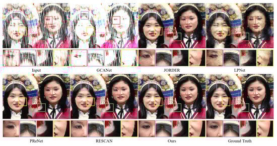 For better extraction of image features, the number of MERBs is set to 12, as shown in Figure 1. In the training process, this design uses the Adam optimizer, where the default and parameters are 0.9 and 0.999, respectively. All experiments and tests in this paper use the PyTorch framework, and the graphics card is an NVIDIA Geforce RTX 3080Ti GPU (12G). To improve performance, the batch size is set to 32, the in the loss function is set to 0.2, and the initial learning rate is set to 0.001. For the Rain100L/H dataset, we train the network with 200 epochs and halved the learning rate every 50 epochs in the training process. For the Rain800/1400 dataset, we use 100 epochs, and the learning rate is halved every 25 epochs.