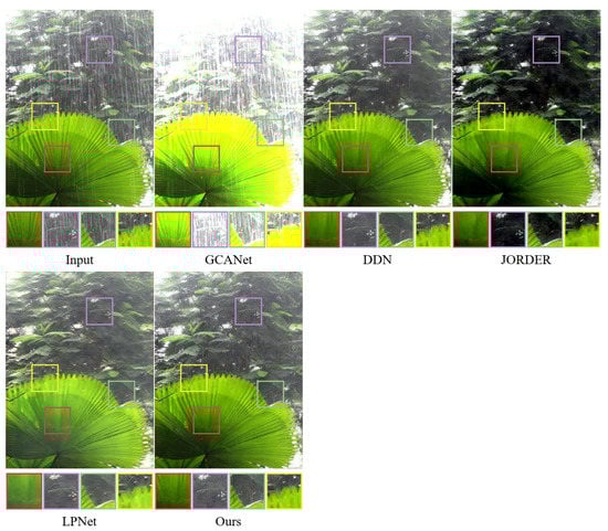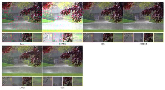 To further evaluate the rain removal effect of the method in real scenarios, we tested the proposed algorithm and the comparison algorithm in this paper on real datasets. For the fairness of the performance comparison, all methods use the weights of the pre-trained models obtained from the Rain100H dataset. As shown in Figure 7 and Figure 8, the method proposed in this paper produces a more natural and enjoyable recovered image compared to the mainstream methods. Specifically, it can be seen from the zoomed-in local details that GCANet has a large amount of rain streak residue and does not recover the image well; the DDN algorithm also has rain streak residue and poor feature processing of local regions, resulting in partial texture distortion and blurred image background; while the JORDER and LPNet algorithms also have blurring and color distortion.