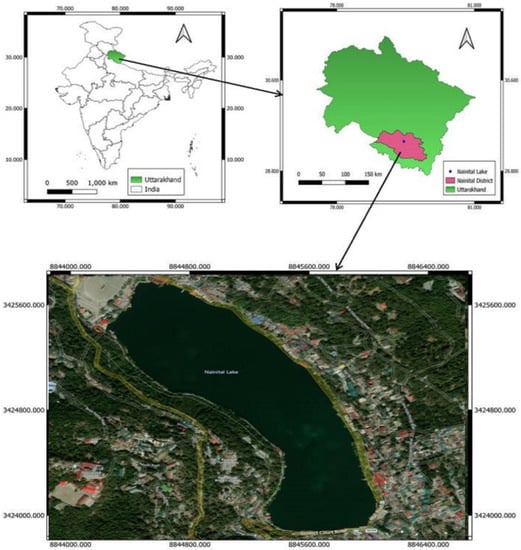 Nainital Lake (Figure 1) is situated in the middle of the Nainital town of Uttarakhand State of India. It is located at an altitude of 1944 m above sea level, at a latitude of 29°23′ N and a longitude of 79°27′. The lake is mango-shaped, approximately 2.5 km in circumference, and surrounded by mountains. The highest are Naina in the north, Deopathaon in the west, and Ayarpathaon in the south. The main water source in Nainital Lake is rainwater and natural base flow. It is fed by twenty water channels, from which only two are perennial open drains [44]. The average annual rainfall of Nainital is 3500 mm, of which 85% is received during the southwest monsoon season [45].