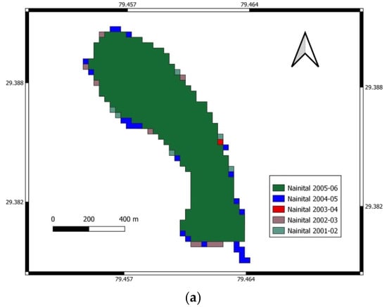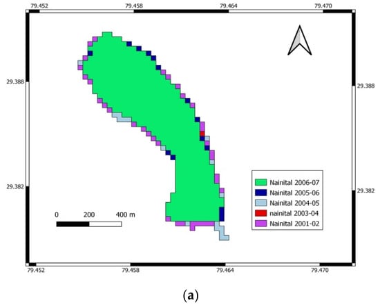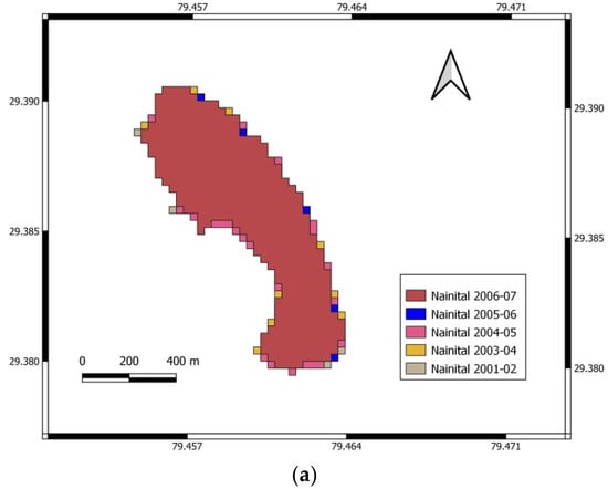 In contrast, a 3.16% deviation was noted by using WRI. Due to the higher accuracy, the NDWI method’s areas were considered accurate areas of Nainital Lake in different seasons from 2001 to 2018. The water spread mapping and spatial changes in water spread from 2001–2002 to 2017–2018 of Nainital Lake using NDWI are shown in Figure 2, Figure 3 and Figure 4 for the periods November to February, March to June, and July to October, respectively.