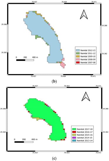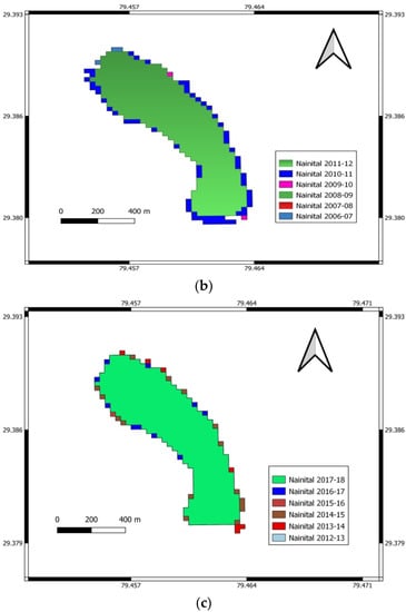 Water spread mapping and spatial changes in water spread from 2001–2002 to 2017–2018 for July to October. (a) Variation of water in Nainital Lake from July to October for 2001–2002 to 2005–2006. (b) Variation of water in Nainital Lake from July to October for the years 2006–2007 to 2011–2012. (c) Variation of water in Nainital Lake from July to October for 2012–2013 to 2017–2018.