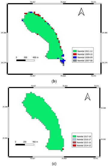 Water spread mapping and spatial changes in water spread from 2001–2002 to 2017–2018 for November to February. (a) Variation of water in Nainital Lake from November to February for 2001–2002 to 2006–2007. (b) Variation of water in Nainital Lake from November to February for 2007–2008 to 2012–2013. (c) Variation of water in Nainital Lake from November to February for 2013–2014 to 2017–2018.
