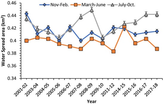The magnitude of the trend for the period November to February, March to June, and July to October was −0.00070 km2/year, −0.00187 km2/year, and −0.00123 km2/year, respectively. The maximum decrease in water spread area has been obtained for the period March to June (−7.70%), which was followed by the period July to October (−4.67%) and the period November to February (−2.79%).