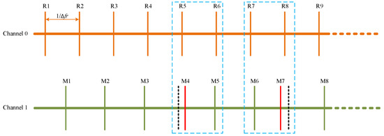 Figure 2b shows the relationship between measured distance and measuring time when the target is moving away at the same speed. As the target mirror goes away, the measured distance within the non-ambiguity range increases. In Figure 2a, delayed time is bigger than as the target mirror is moving away. So the ratio between delayed time and update period is growing gradually. Once the measured absolute distance is equal to one non-ambiguity range or multiple non-ambiguity range , R peaks and M peaks align temporally. This situation leads to dead zones in the traditional dual-comb range, because R peaks and M peaks are overlapped in the same input channel [24]. As the target mirror continues to move, the R peaks no longer align with the M peaks and the delayed time between paired R peaks and M peaks starts to increase from 0. Then, the delayed time changes as the same pattern as the target mirror has not crossed the dead zone before. So the measured distance is wrapped after the target mirror crosses the dead zone as Figure 2b shows.
