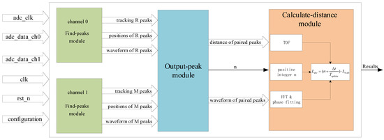 The output-peak module implements the algorithm of extending the non-ambiguity range as shown in Figure 4. It calculates the distance between paired R peaks and M peaks in the sample points unit so that the integer part of the in Equation (2) can be obtained by combining the sampling rate of ADC. Furthermore, the output-peak module will calculate the positive integer n according to the algorithm described in Figure 4. The output-peak module outputs the waveform of paired peaks and the distance between paired R peaks and M peaks, and the positive integer n as denoted by n in Figure 5. The calculate-distance module will perform a fast Fourier transform (FFT) and phase fitting as illustrated in [20,22] to obtain the fractional part of delay time . In addition, the calculate-distance module will calculate the final value of the absolute distance with the positive integer n and delayed time , then output results.