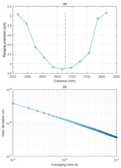 After getting the right n, we also obtained the relationship between the measured distance and ranging precision as presented in Figure 8a. The target mirror was fixed at different positions. The signals were sampled for about 10,000 ms so that there were approximately 10,000 results of measurements for each position. In Figure 8a, the ranging precision is converging as the target mirror moves towards the and the ranging precision is diverging as the target mirror moves away from the . Figure 8b shows the Allan deviation at different averaging times from 1 ms to 100 ms when the target mirror was fixed near the . Without averaging, the Allan deviation in 1 ms is 3.89 m at the position near the as shown in Figure 8b. After 100 ms averaging, the Allan deviation can reach about 0.37 m. The precision is determined by the timing jitter of the dual-comb system [36,38,39,40], which can be further improved by introducing multi-pulse consequence [41,42].