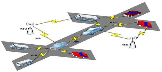 According to World Health Organization research [1], road accidents claim the lives of almost 1.3 million people every year around the world. VANETs offer a viable approach for avoiding such incidents. VANETs are mobile ad hoc networks [2] that can operate with a diversity of models, such as the Vehicle-to-Infrastructure (V2I) model and Vehicle-to-Vehicle (V2V) model, as depicted in Figure 1. Advanced communication protocols such as IEEE 802.11p and IEEE 1609 send information between vehicles in the fundamental VANET architecture. VANETs encompass a diverse set of utilizations divided into two categories, i.e., comfort and safety applications. Cooperative collision prevention and traffic updates are examples of safety applications.