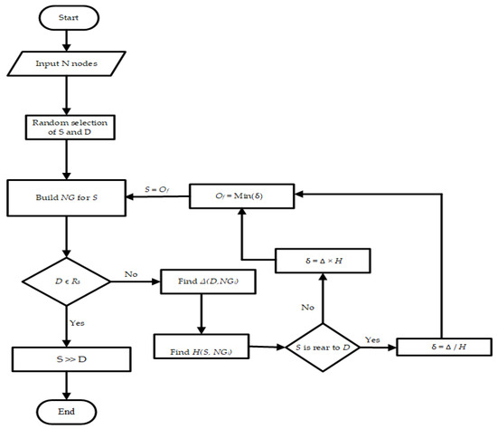 Figure 2 depicts a detailed outline of the proposed protocol, which achieves direction-based priority assignments among numerous routes to a destination. Collisions among nodes on a wide scale could be caused by an ineffective routing strategy for vehicle collision prevention. As a result, routing performance becomes equally essential in addition to the importance of node collision detection. Delivering timely and reliable WMs is crucial for implementing collision-prevention procedures. Once a source node is willing to send a WM, and there is only one path to the destination, following that path becomes unavoidable. When there are numerous paths to the target, choosing the optimum path with the least latency, the fewest packet losses, and the highest throughput becomes critical. Greedy protocols use distance as a parameter to find the optimum path, whereas direction-based Greedy protocols look for available relay nodes in the direction of the destination node. All paths to the target are examined for a specified time step, such as τ0. However, the node’s mobility is very high; they regularly enter and exit each other’s communication ranges, resulting in continual topological changes in bi-direction circumstances. Due to this dynamic nature, two scenarios may arise during message delivery.