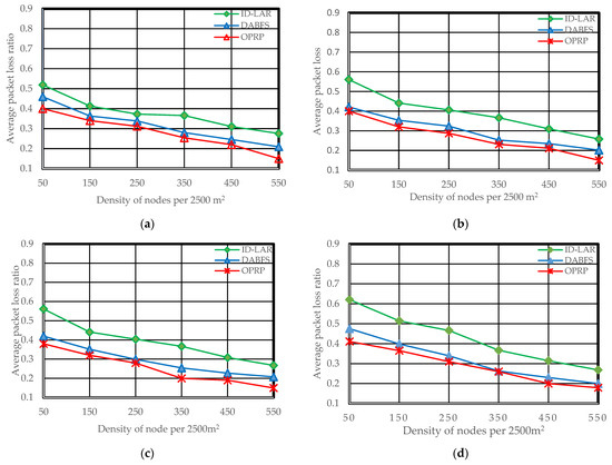 Due to the repeated network changes, the path choice during WM transmission remains crucial. In VANETs, topological changes are frequently caused by fast nodes traveling in various directions. The nodes continuously move, enter, and exit each other’s communication ranges. As a result, paths are frequently dropped and new ones generated, potentially leading to network partitions. As a greater number of nodes enhances network connectivity and lowers packet drops, the probability of such network partitioning seems higher in scatter networks than in dense networks. The packet loss ratio decreases as the density increases because nodes are closer. Hence, the proposed protocol with clustering and the compared protocols without clustering becomes more intimate in the results. The three protocols’ results illustrated in Figure 5a–e reveal such behavior.