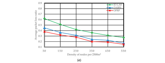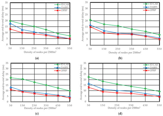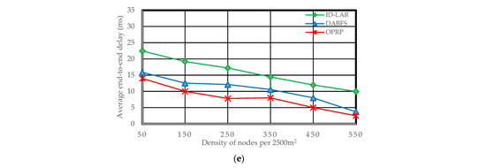 where the terms Er and Edi and Rp stand for the end-to-end delay ratio, the individual packet delay, and the total number of packets received. Due to the increased number of hops in DABFS and ID-LAR, as a result of the path reconstruction process, as detailed in Section 4.2.1, the total number of send and receive operations also increases. The efficiency of both DABFS and ID-LAR is negatively impacted by the growing number of transmitting and receive operations because they are time-consuming. However, by choosing the next hops traveling in the target node’s direction, OPRP reduces this latency. The end-to-end delay decreases as the density increases because nodes are closer. Hence, the proposed protocol with clustering and the compared protocols without clustering become clearer in the results. Figure 6a–e reveals Scenario 5.