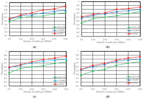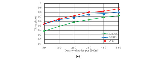 As it counts the number of packets successfully delivered to target nodes, throughput is a crucial metric for performance evaluation. End-to-end delays and packet losses impact the throughput of the network. Figure 7a,b show improved throughput of OPRP compared to DABFS and ID-LAR due to our original direction-based path selection. Additionally, OPRP follows the same pattern under challenging circumstances where the source and destination are on the opposite sides of the road by significantly improving throughput, as demonstrated in Figure 7c,d. Additionally, as shown in Figure 7e, OPRP outperformed the other protocols, improving throughput restoration state packet forwarding.
