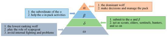 Wolves in nature have a strict hierarchy. The higher the rank of the wolf, the more dominant it is over the whole population and the stronger it is in the hunting process. A rigid hierarchy is crucial in the hunting process. However, in the hunting mechanism of GWO, as the position updating mechanism described by Equation (8), the leaders have the same power (1/3) over the population. It’s apparent that the distribution of power is incongruent with the real hierarchy.