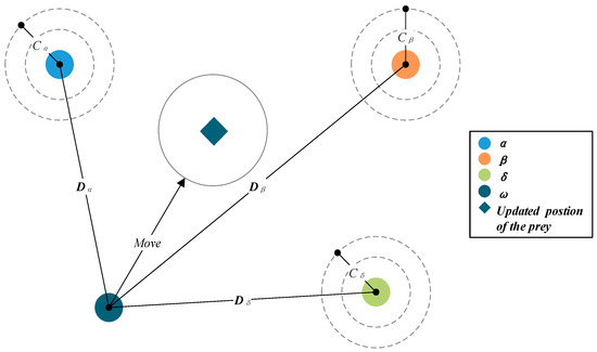 where C1, C2 and C3 are random coefficient vectors defined by Equation (4). A1, A2 and A3 are coefficient vectors defined by Equation (3). , and represent the positions of α, β and δ. GWO pseudocode are shown in Algorithm 1, and the location update of wolves are exhibited in Figure 2.