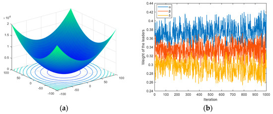 Adaptive weight coefficients of the leaders. (a) 2-D version of Sphere function; (b) Values of wα, wβ, and wδ.