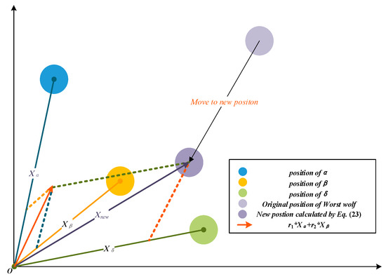 Miao et al. [50] repositioned the three wolves with the worst quality by using α, β, δ and the original positions in each iteration to remove the poor candidates and prevent search bias. Inspired by this idea, we propose a new individual repositioning method, which ignores the original position information and only uses the position of the head wolves, to speed up the convergence of the algorithm. The corrected position of the agents can be calculated by Equation (23), and the relocation process is shown in Figure 5.