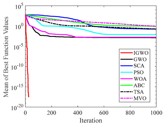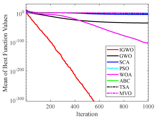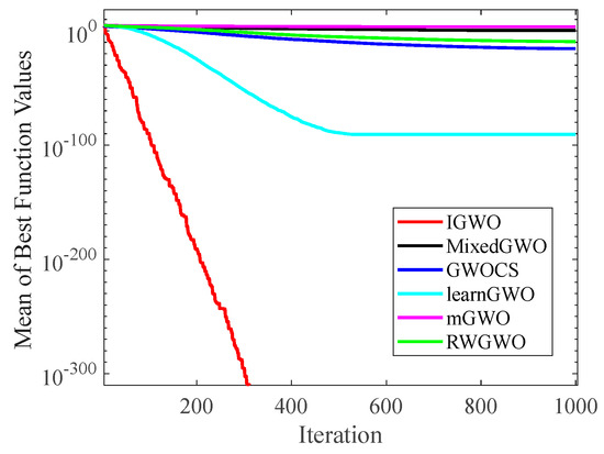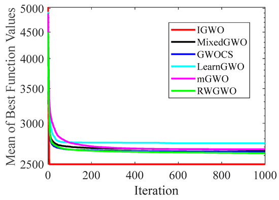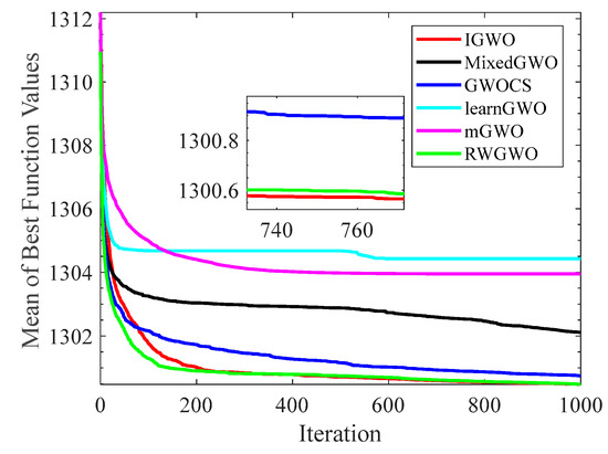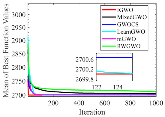 Figure 6 and Figure 7 indicates that the curve of IGWO can converge to the global optimum at a gallop, confirming that IGWO has better search accuracy and speed on F1 and F3. Furthermore, LearnGWO performed relatively well on F1 and F3 in comparison to MixedGWO, GWOCS, RW_GWO and mGWO, with the accuracy up to 1E10-120. Figure 8 illustrates that after about forty iterations, IGWO has already reached the final result with higher accuracy. From Figure 9, it can be observed that both IGWO and mGWO can converge to the optimal value on F9 rapidly, but IGWO can avoid the local optimum more efficiently. Figure 10 shows that RW_GWO and IGWO own higher convergence accuracy on F12, and IGWO ranks first by virtue of slightly higher accuracy. For the function F14, Figure 11 exhibits that the convergence speed of the six algorithms is similar, but the convergence accuracy of IGWO is slightly better. As shown in Figure 12 and Figure 13, compared with other improved versions, IGWO has noticeable virtue both in convergence speed and accuracy. In addition, Figure 13 demonstrates that the accuracy gap of the six algorithms is small, yet IGWO possesses an obvious advantage in the search speed. In summary, as presented in Figure 6, Figure 7, Figure 8, Figure 9, Figure 10, Figure 11, Figure 12 and Figure 13, the proposed strategies can visually improve the search accuracy and convergence speed on most functions.