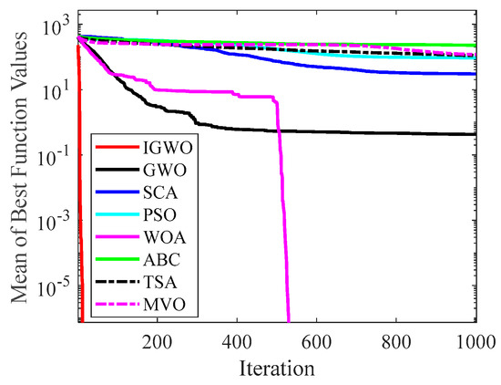 Therefore, from the above discussions of Table 3, Table 4 and Table 5 and Figure 6, Figure 7, Figure 8, Figure 9, Figure 10, Figure 11, Figure 12 and Figure 13, it can be concluded that the proposed IGWO has better optimization precision and convergence speed for the majority of the twenty benchmarks, which indicates that the proposed strategies can effectively improve the performance of the algorithm.