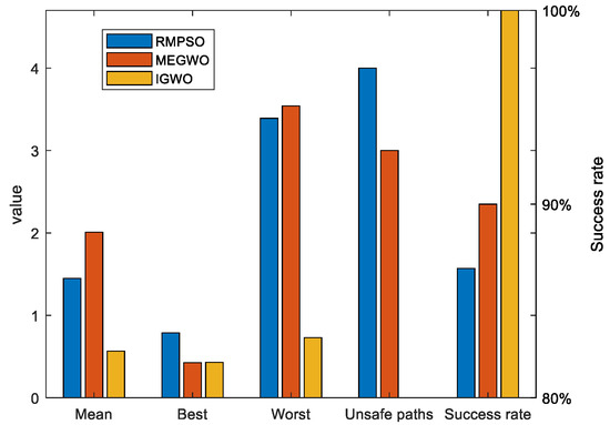 For the performance of the algorithms in case 1, Figure 27 shows that the planned trajectory of RMPSO and IGWO are relatively stable, while the thirty trajectories of MEGWO fluctuate slightly. Table 11 shows that the average, shortest, and longest length of the paths planned by IGWO are all the smallest among the three algorithms. Furthermore, RMPSO and MEGWO generate three failed paths in the thirty independent experiments, and IGWO plans thirty safe paths successfully, indicating that IGWO possesses better stability. Figure 29 turns the statistical results into a bar graph, more intuitively showing the superiority of IGWO in case 1.