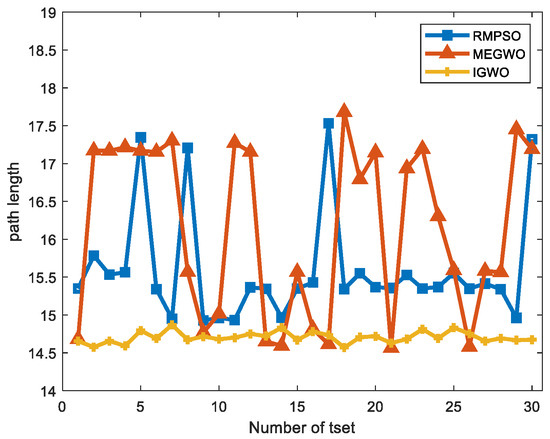 Figure 31 and Figure 32 exhibit the length of thirty paths obtained by each method. It can be observed that there are obvious differences in the performance of the three methods. In case 1, IGWO gets the optimal path in every attempt, and the path length is the most stable, while MEGWO has apparent oscillation. For case 2, IGWO obtains the maximum number of optimal paths compared with RMPSO and MEGWO. Even if the environment complexity is increased, the length of the paths generated by IGWO is stably between 14.5 and 15. In contrast, the path length obtained by RMPSO and MEGWO are sometimes less than 15 and sometimes more than 17. Therefore, it is concluded that the trajectories generated by IGWO are both the shortest and the safest.