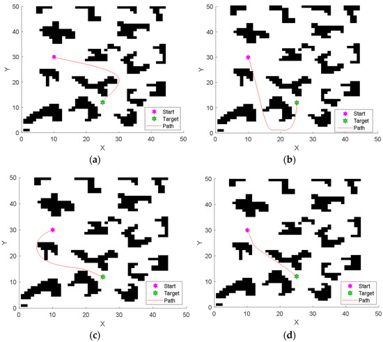 Paths planned by four algorithms in complex obstacle environment. (a) Results of RMPSO; (b) Results of MEGWO; (c) Results of mGWO; (d) Results of IGWO.