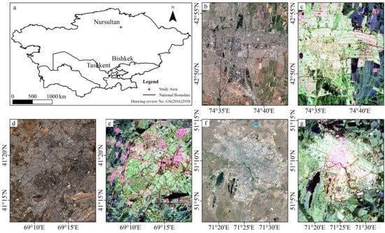 Locations and satellite images of the study areas. (a) Location of the study cites. (b) Sentinel-2 RGB image of Bishkek. (c) GF-3 Pauli-RGB image of Bishkek. (d) Sentinel-2 RGB image of Tashkent. (e) GF-3 Pauli-RGB image of Tashkent. (f) Sentinel-2 RGB image of Nursultan. (g) GF-3 Pauli-RGB image of Nursultan.