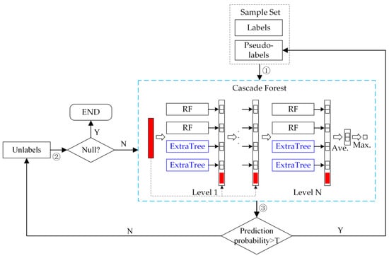 In order to reduce overfitting and improve classification accuracy with a limited number of labeled samples, we propose a self-trained deep forest (STDF) method. A training set containing labeled and unlabeled samples will be inputted into the cascade forest, and the unlabeled instances will be labeled by iteration over the labeled samples. These pseudo-labeled samples can be used to train the model for higher performance in ISA extraction. As illustrated in Figure 2, the proposed STDF classification method is composed of three major steps: