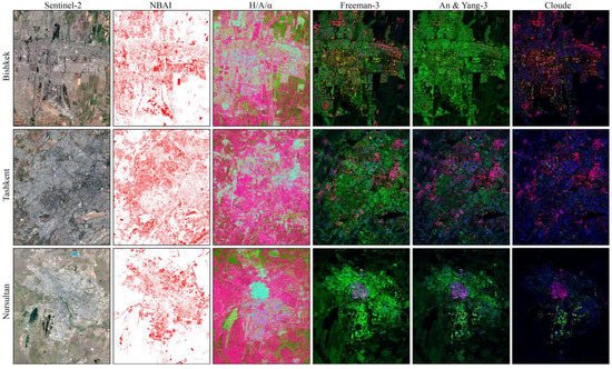 The polarimetric features applied in this paper were obtained by applying decomposition methods. These polarimetric features reflect the scattering mechanism of ground objects on the SAR bands. Figure 3 shows the ISA extraction results for NBAI based on multispectral bands and pseudo-color images of various polarimetric decomposition methods in the three study areas.