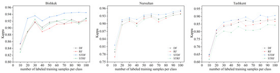 Since the training samples were randomly selected and the selected samples were not necessarily uniformly distributed and representative, we performed 10 experiments with each number of labeled samples and the accuracy of results was evaluated and averaged. The results for different classification methods using different numbers of labeled training samples to extract ISA are shown in Figure 4. Accordingly, as the number of labeled training samples increased, the Kappa coefficients of four strategies improved for all three study areas, and the Kappa values for STDF were basically higher than those for the other three methods. As the number increased to 30, the Kappa values greatly improved. Additionally, learning curves for Kappa values for STDF always stayed at the highest level compared with DF, RF and STRF classifiers for all three study areas. In practice, more labeled training samples represent more time consumption. There is a trade-off between extraction accuracy and time consumption. Therefore, in the following experiments, we randomly selected 30 labeled samples per class.