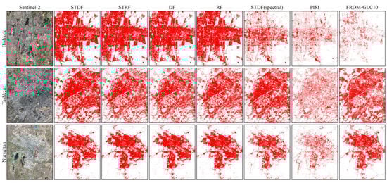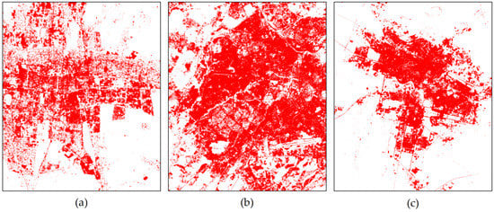 ISA extraction results based on Sentinel-2 data from different seasons and GF-3 data using the STDF method. Red indicates ISA. (a) Bishkek. (b) Tashkent. (c) Nursultan.
