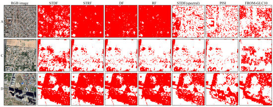 Comparison of ISA extraction results with a local zoom. The images in the first column were taken from Google Earth. Red indicates ISA. Areas A, C, and D correspond to those in Figure 5.