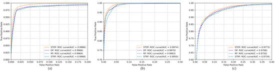 ROC analysis is a graphical approach for analyzing the performance of classifiers which uses true positive rates (TPRs) and false positive rates (FPRs). AUC is a single scalar value that complements ROC, where a greater area means better performance. The ROCs and AUCs of different methods for the three experimental areas are shown in Figure 7. From Figure 7, it can be seen that, compared with the other methods, the proposed STDF has a relatively high TPR and a low FPR and that it achieved the highest ROC value. This indicates that STDF has a better classification performance in cases of limited labeled samples.